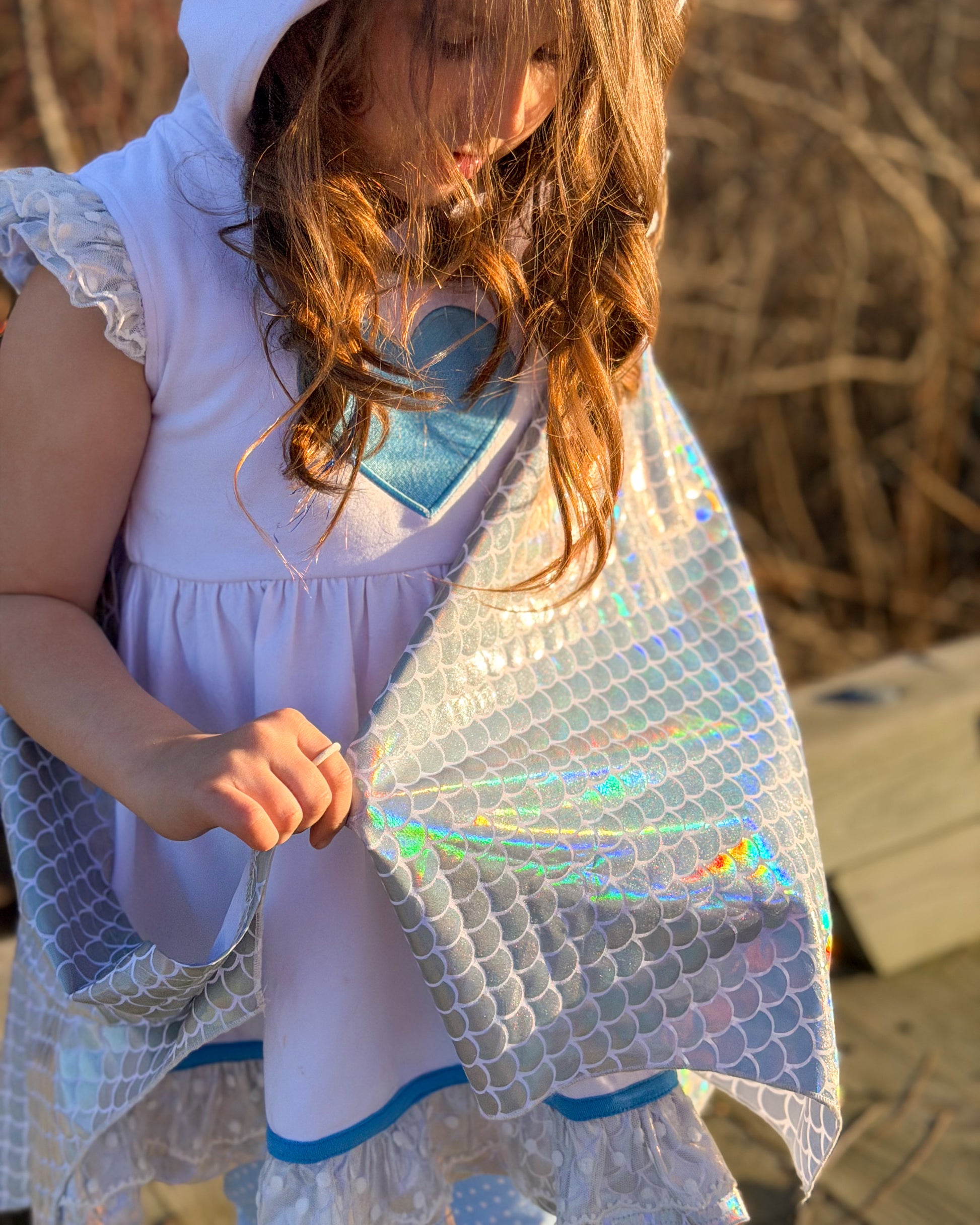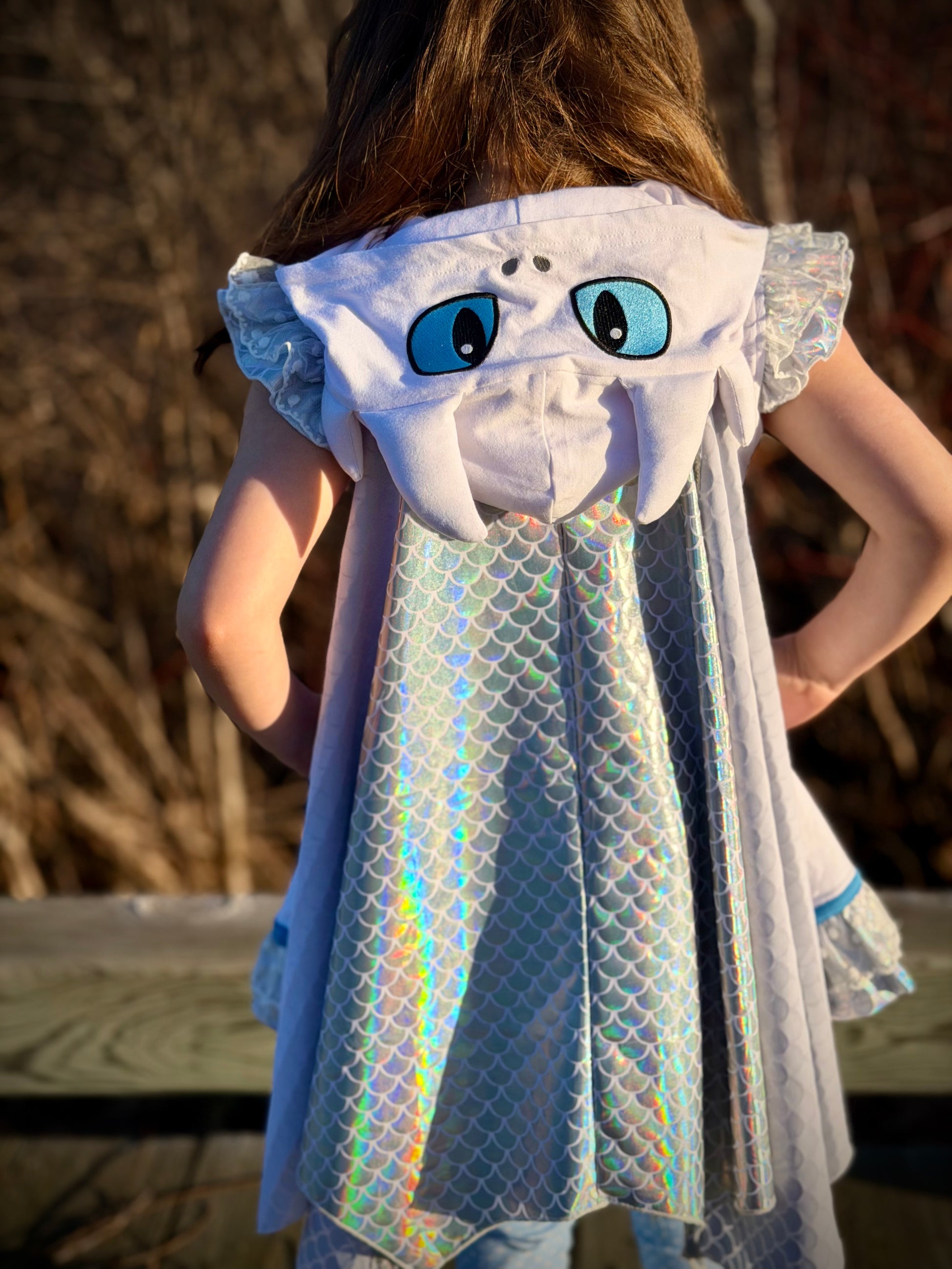 Made from soft, breathable cotton, the tunic features an embroidered dragon hood, shimmering detachable wings that catch the light like real dragon scales, and a sweet embroidered chest detail. Coordinating leggings are included for comfort and coverage during every twirl, flight, and imaginative quest.